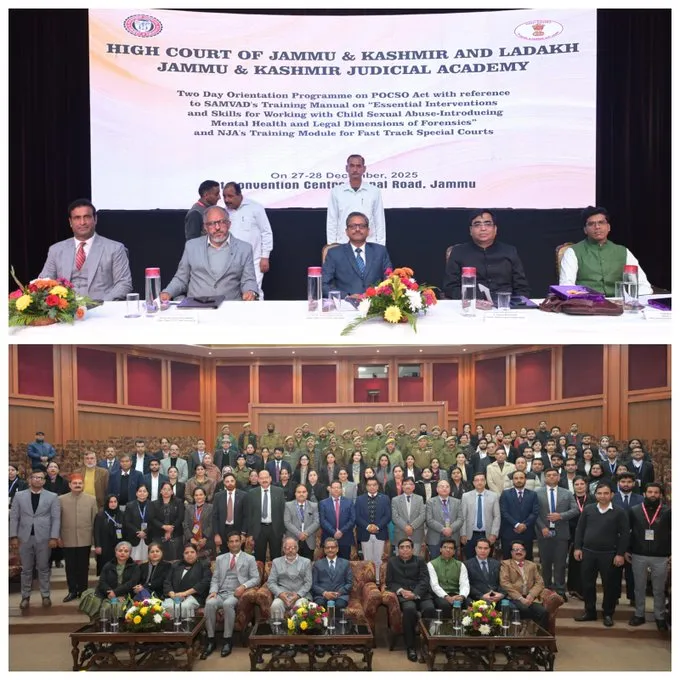 Jammu, Dec 27: The Jammu & Kashmir Judicial Academy on Saturday commenced a two-day orientation programme on the Protection of Children from Sexual Offences (POCSO) Act, 2012, with reference to SAMVAD’s Training Manual on “Essential Interventions and Skills for Working with Child Sexual Abuse – Introducing Mental Health and Legal Dimensions of Forensics” and the National Judicial Academy’s Training Module for Fast Track Special Courts, at the Convention Centre, Canal Road, Jammu.